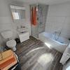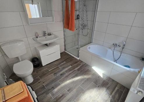 Das Badezimmer im Erdgeschoss verfügt über eine Fußbodenheizung und einen Spiegelhandtuchheizung sowie integrierten Downlights.