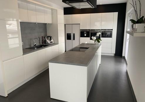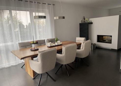 Der offen gestaltete Wohn- und Essbereich mit integrierter Küche bildet das Herzstück des Hauses. Die moderne Küche fügt sich harmonisch in das Raumkonzept ein und ermöglicht kommunikatives Kochen in geselliger Atmosphäre. Große Fensterfronten sorgen für viel Tageslicht und bieten einen direkten Zugang zur weitläufigen Terrasse und in den Garten.