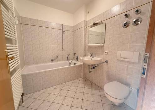 Das Badezimmer verfügt über eine Badewanne, ein Waschbecken, ein WC und einen Handtuchheizkörper. Eine Abstellkammer in der Wohnung sowie ein eigenes und Kellerabteil rundet das Platzangebot ab.