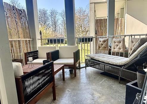 Zur Wohnung gehören zudem ein Balkon, eine Terrasse mit Zugang zum Gemeinschaftsgarten, sowie ein überdachter Stellplatz. Das Gebäude verfügt über eine Gas-Zentralheizung (Baujahr Wärmeerzeuger 2006). Energieeffizienzklasse C.