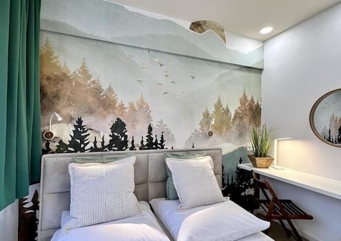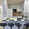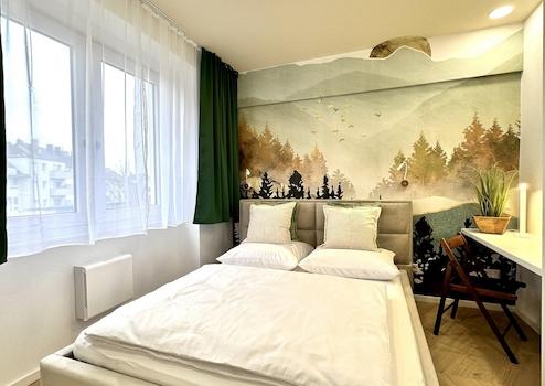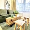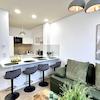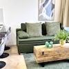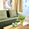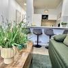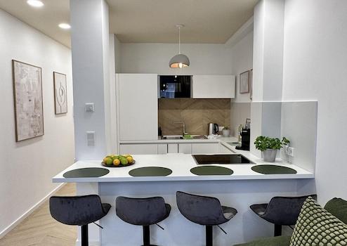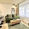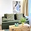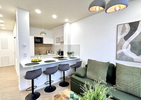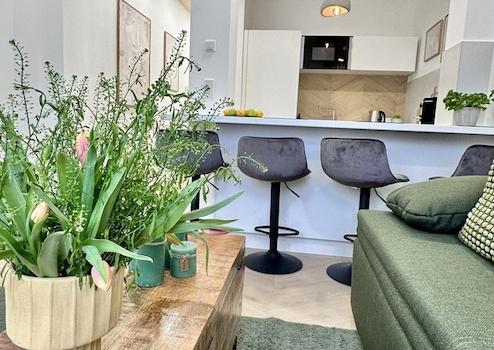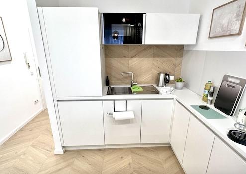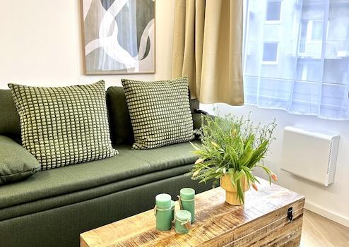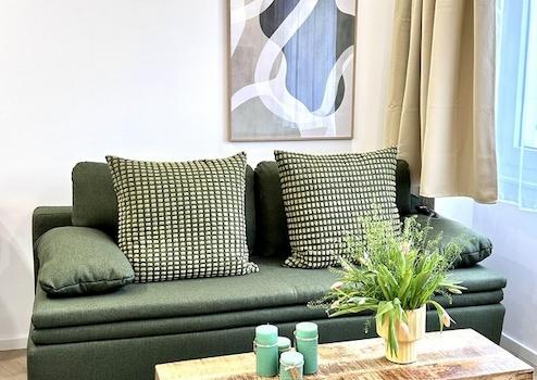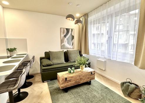 1 Schlafzimmer, eine offene Küche (vollausgestattet), Wohnzimmer mit Schlafcouch und ein stilvolles Badezimmer sind neu für Euch designt.