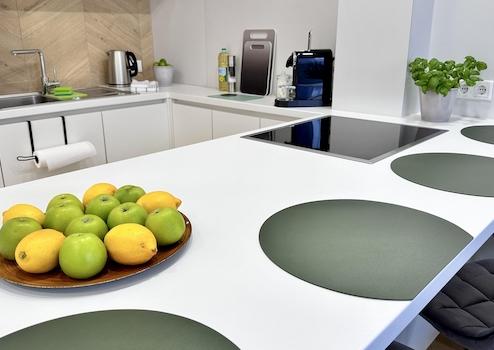 Im Ess- und Wohnbereich befindet sich auch eine offene voll ausgestattete Küche. Hier findet ihr eine große Auswahl an Kochutensilien, Geschirr und eine Nespresso-Maschine. Ein großer, kommunikativer Essbereich für 4 Personen steht Euch zur Verfügung.