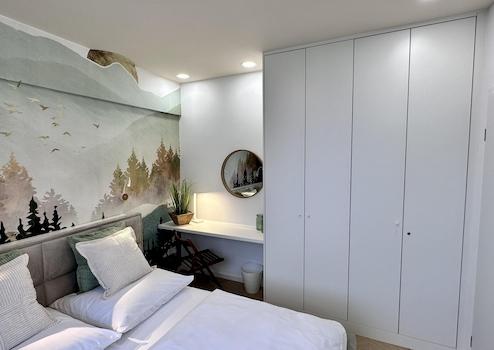 Im Schlafzimmer befindet sich ein kuscheliges Bett und ein Kleiderschrank. Dort ist auch ein Schreibtisch als Arbeitsplatz vorhanden.