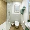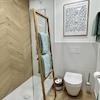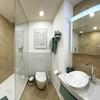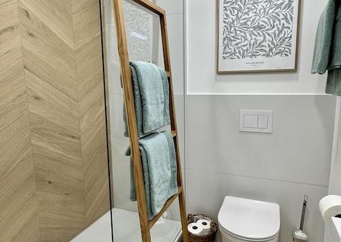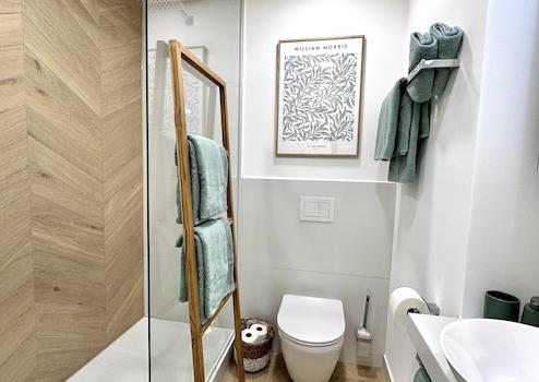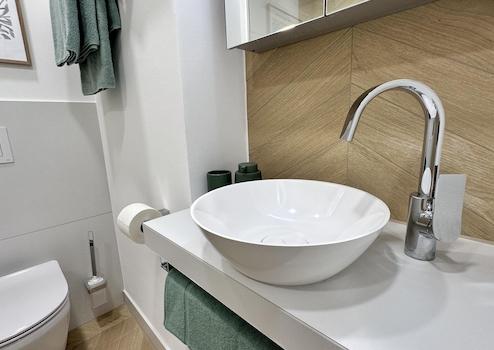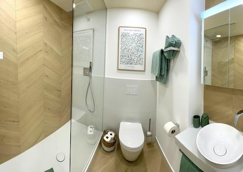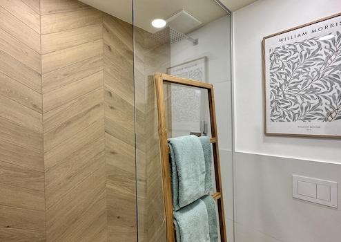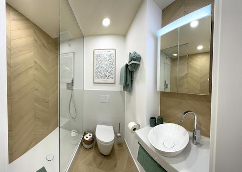 Ein neues Badezimmer mit bodentiefer Regendusche ergänzt das Appartement.
