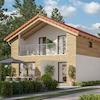 Anmutig und modern ist die Architektur des Energiesparhauses mit Satteldach. Die Fassade wird von einer waagerechten Holzverschalung und der Auswahl der Fensterformate geprägt. Der Grundriss des Hausentwurfes sieht im Erdgeschoss einen geräumigen Wohn- und Essbereich mit einer separaten Küche vor.