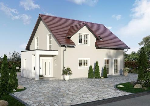 Ungebrochen ist die Begeisterung für das Bauen und Wohnen im Landhausstil. Dieser Hausentwurf interpretiert den Landhausstil in einem modernen Erscheinungsbild. Eine Wohnraumerweiterung mit überdachtem Hauseingang prägt, gemeinsam mit einem Zwerchgiebel mit Satteldach, die Frontseite des Landhauses. Auf 174 m² Grundfläche bietet der Entwurf viel Platz für die ganze Familie. Der Grundriss bietet im Erdgeschoss einen großen Wohn-/Ess- und Kochbereich, der sich über eine große Panorama-Hebeschiebetür und vier Terrassentüren zum Garten hin öffnet.