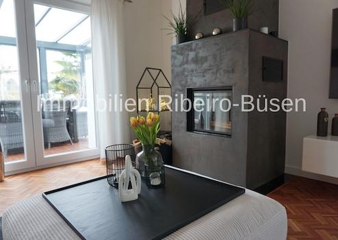 Der großzügige Wohn- und Essbereich mit offener Küche bildet das Herzstück des Hauses und schafft einen einladenden Treffpunkt für Familie und Gäste. Ein Kaminofen in puristischer Beton-Ciré-Optik sorgt zusätzlich für eine angenehme und behagliche Wohnatmosphäre. Direkt vom Wohnbereich aus öffnet sich der lichtdurchflutete Sommergarten mit umlaufenden Schiebeelementen und hochwertigen Holzfliesen, der den Wohnraum harmonisch erweitert und einen schönen Blick in den Garten ermöglicht.