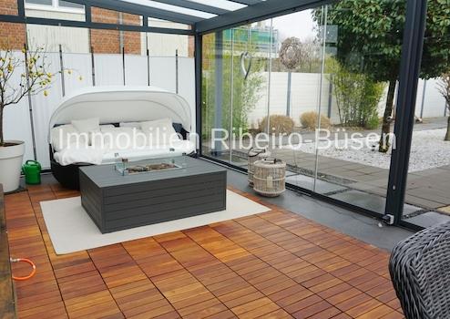 Das ca. 659 m² große Grundstück wurde geschmackvoll gestaltet und greift die klare Linienführung der Architektur auch im Außenbereich auf. Der Garten mit ruhigen Zen-Elementen bietet eine angenehme Atmosphäre und lädt zum Entspannen ein. Ein besonderes Highlight ist der lichtdurchflutete Sommergarten mit Aluminium-Glas-Konstruktion, der den Wohnbereich erweitert und einen schönen Blick in den Garten ermöglicht.
