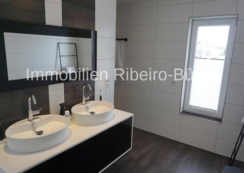 Das großzügige Tageslichtbad im Obergeschoss verfügt über zwei Waschbecken, ein WC sowie einen komfortablen, ebenerdig zugänglichen Duschbereich.
