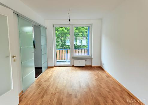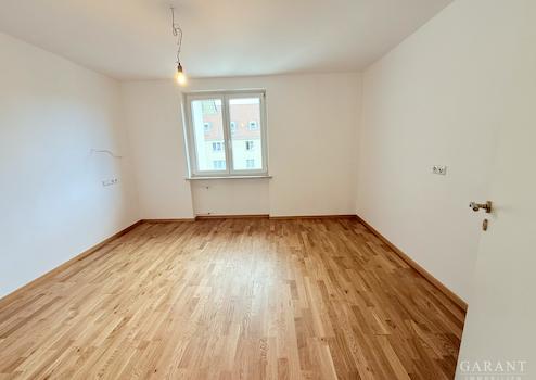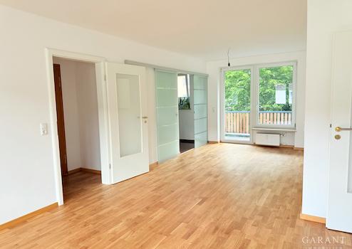 Die Wohnung überzeugt bereits beim Betreten: edles Echtholzparkett und stilvolle Natursteinfliesen schaffen eine warme, einladende Atmosphäre. Große Fenster und ein elegante Glasschiebetür zur Küche sorgen für ein lichtdurchflutetes Raumgefühl.