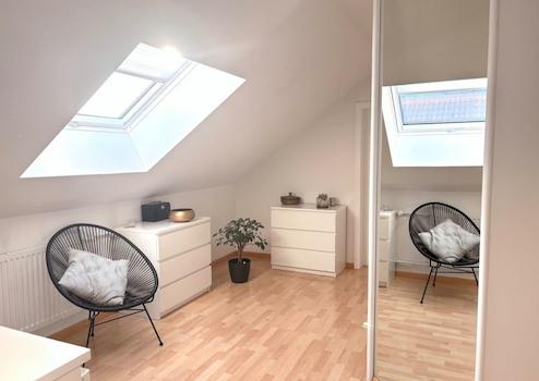 Im Obergeschoss erwartet Sie ein privater Rückzugsbereich mit einem geräumigen Schlafzimmer inklusive maßgefertigter Einbauschränke.