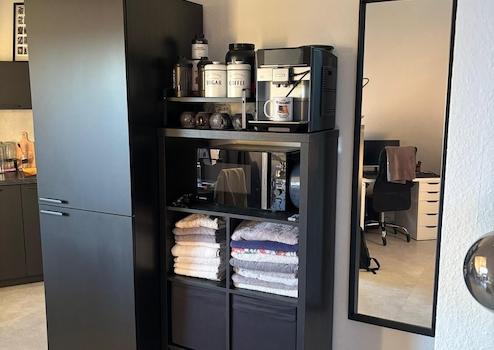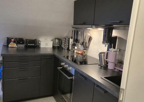 Die Wohnung ist teilmöbliert. Zur Ausstattung zählt eine hochwertige Küche mit einem Backofen, Induktionskochfeld, Spülmaschine sowie einer großen Kühl- Gefrierkombination.