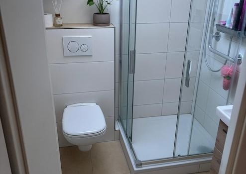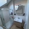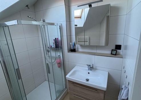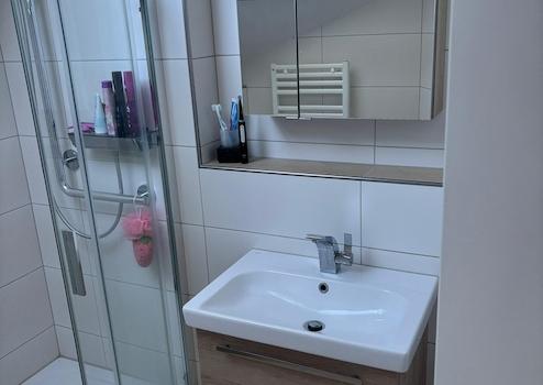 Das renovierte Badezimmer verfügt über eine moderne Duschkabine sowie einem Waschtisch mit Unter- und Spiegelschrank.