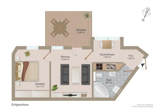 Die Wohnung verfügt über einen gut durchdachten Grundriss. Vom Eingangsbereich gelangen Sie in die geräumige Küche mit integriertem Essbereich und vorhandener Einbauküche. Der anschließende Wohnbereich überzeugt durch seine angenehme Größe und den direkten Zugang zur Terrasse – ein gefragtes Ausstattungsmerkmal, das die Wohnqualität erhöht und die Attraktivität für Mieter nachhaltig steigert. Das Schlafzimmer bietet ausreichend Stellfläche und wird durch ein großes Fenster mit Tageslicht versorgt. Das Badezimmer ist mit einer Eckbadewanne ausgestattet und verfügt zusätzlich über einen Waschmaschinenanschluss.