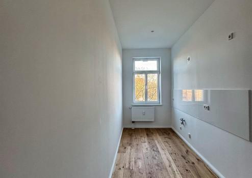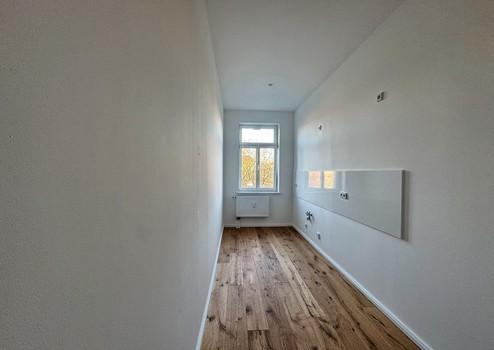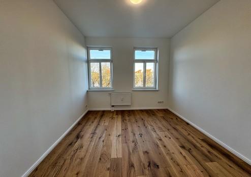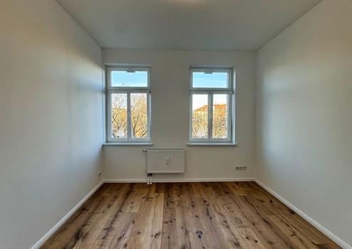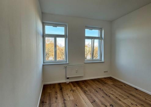 Der Wohn- und Schlafbereich ist großzügig geschnitten und bietet dank seiner klaren Struktur vielfältige Einrichtungsmöglichkeiten. Ob gemütliche Sofalandschaft, Arbeitsplatz, Schlafzone oder kreativer Mix – der Raum lässt sich hervorragend gliedern. Große Fenster sorgen für beeindruckende Helligkeit und eröffnen den Blick ins Grüne. Ein echter Connewitzer Vorteil: urbane Szenelage – und dennoch dieses ruhige, sanfte Grün direkt vor der Tür. Die Wohnung selbst liegt angenehm ruhig im Haus, eingebettet in eine freundliche, entspannte Nachbarschaft.