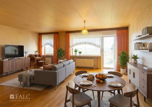 Das Herzstück der Wohnung bildet der große, helle Wohn- und Essbereich, der durch seine offene Gestaltung ein freundliches und großzügiges Raumgefühl vermittelt. Von hier aus gelangen Sie auf den Balkon, der neu gefliest wurde und über eine elektrische Markise verfügt – ideal, um sonnige Tage im Freien zu genießen.