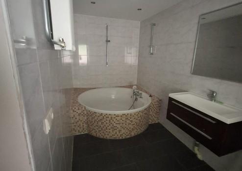 Im EG befindet sich der Wohn-/Essbereich mit offener Einbauküche und Bad mit Badewanne.
