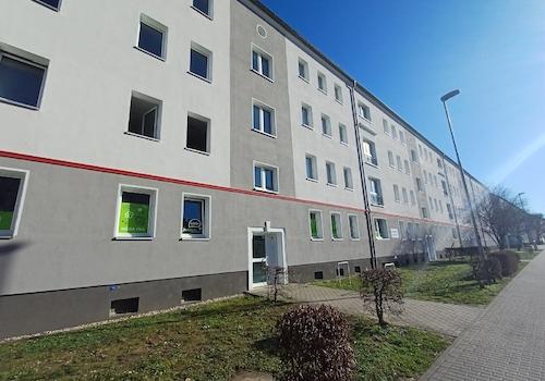 Viergeschossiger Wohnblock in solider Bauweise. Voll unterkellert. Alle 3-Raumwohnungen haben einen Südbalkon, sowie ein Fenster in Küche und Bad. Anschluss Herd, vorwiegend Gas. Die Heizung und Warmwasserversorgung erfolgt über die Zentralheizung und wird durch Fernwärme erzeugt.