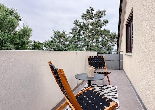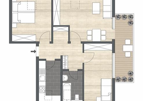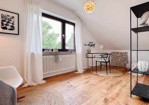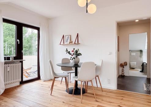 Der großzügige Wohnbereich bildet das Herzstück der Wohnung. Von hier aus gelangen Sie direkt auf den Balkon mit Blick ins Grüne – ein angenehmer Rückzugsort für den ersten Kaffee am Morgen oder entspannte Stunden am Abend. Die durchdachte Raumaufteilung ermöglicht ein harmonisches Zusammenspiel aus Wohnen, Arbeiten und persönlichem Rückzug.