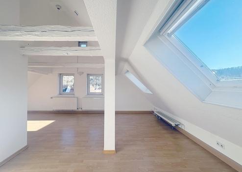 Die Wohnung begeistert durch ihre großen Fensterflächen, die für eine außergewöhnlich helle und freundliche Atmosphäre sorgen. Die hohen Decken unterstreichen den besonderen Charakter der Dachgeschosslage und verleihen den Räumen ein großzügiges, luftiges Wohngefühl.