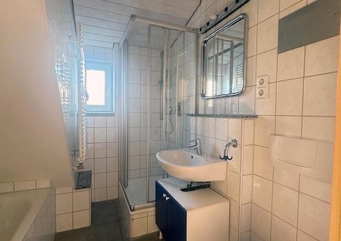 Das Badezimmer überzeugt mit Fliesen, Dusche und Badewanne – perfekt für die schnelle Erfrischung am Morgen oder entspannte Wohlfühlmomente am Abend.