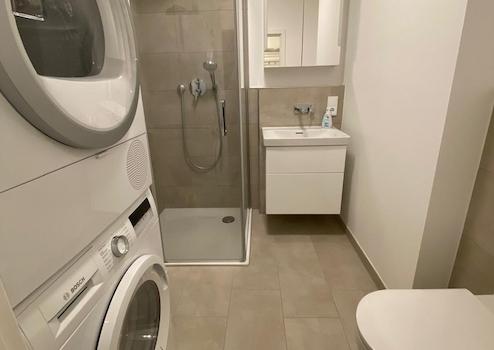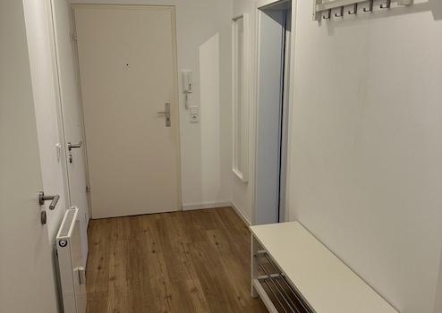 Die Wohnung bietet eine moderne Einbauküche, ein saniertes Badezimmer mit Waschmaschine und Trockner sowie einen gepflegten Gemeinschaftsflur mit Garderobe.