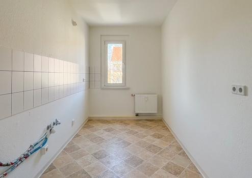 - Küche mit Fenster, Fliesenspiegel im Arbeitsbereich und Platz für eine Einbauküche