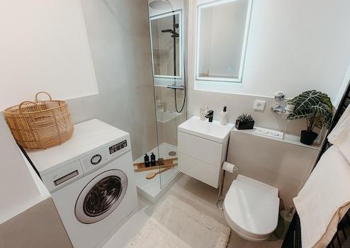 – Komplett renoviertes Bad mit Regendusche, Villeroy & Boch-Toilette, Waschtisch mit Unterschrank und Waschmaschinenanschluss