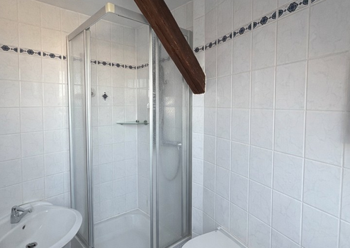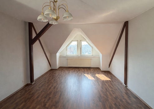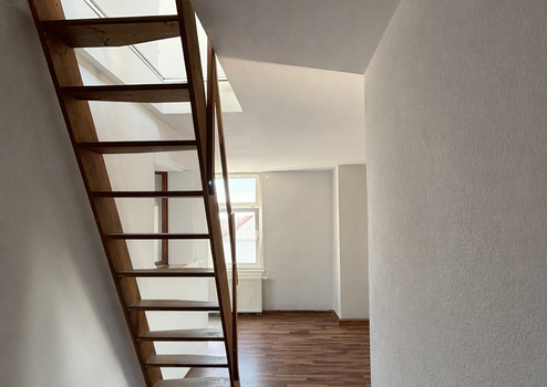 Ein komfortables Badezimmer mit Dusche, Badewanne und Fenster rundet die Ausstattung ab. Über eine Treppe gelangen Sie in den oberen Bereich der Wohnung, wo ein weiterer Raum als Hobby-, Arbeits- oder Gästezimmer genutzt werden kann. Zusätzlich bietet die Wohnung einen praktischen Abstellraum für Stauraum und Ordnung.
