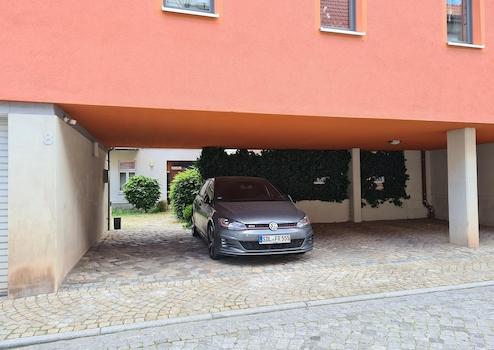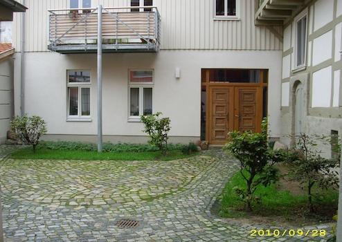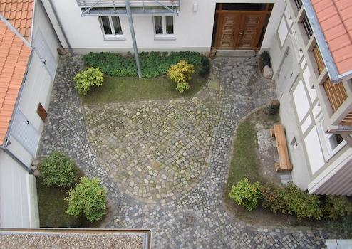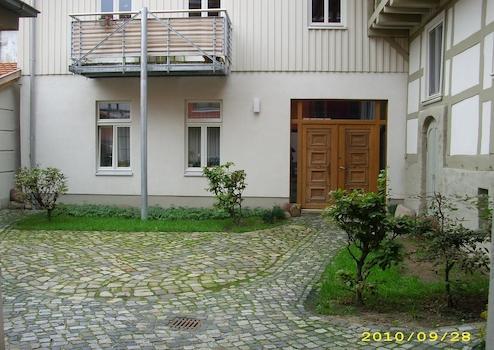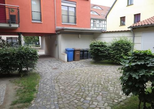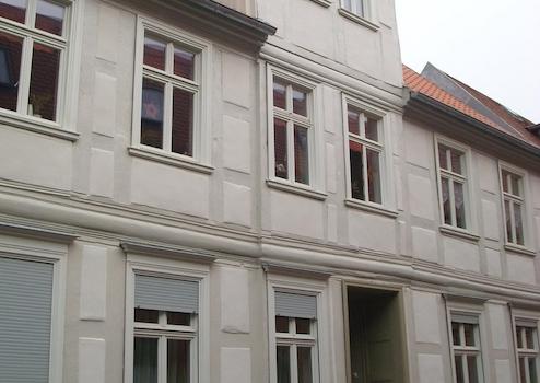 zentrale Lage in der Altstadt von Stendal, alle wichtigen Funktionen sind fußläufig bequem erreichbar, Hauptfassade nach Süden orientiert, Parkplatz unter Neubau Hoock 8, kleiner Innenhof mit Abstellschuppen für Fahrräder
