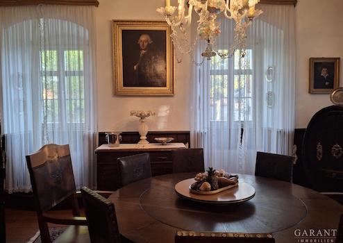 Dieses Adelspalais, klassifiziert als traufständiger Walmdachbau mit Eckquadern, ist flankiert von weiteren großen teilweise auch bewohnbaren Nebengebäuden; darunter geräumige Garagen und ehemalige Stallungen. Zwischen den Gebäuden bilden alte Bäume und verwunschenen Wege den romantischen Gartenbereich.