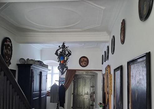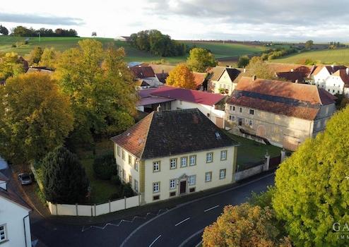 Im Herzen eines Dorfes, unweit von Würzburg, liegt ein historischer Adelssitz mit üppiger, authentischer Ausstattung. Im Hauptgebäude des Anwesens aus dem achzehnten Jahrhundert erstrecken sich etwa 250 Quadratmeter Wohnraum von Musikzimmer bis zu Bibliotheksräumen. Das herausragende, denkmalgeschützte Innenambiente ist mit dem weiten Treppenhaus gekrönt, dessen Stuckdecke wie ein Detail einer barocken Schlossanlage anmutet. Die in den Fluren und Zimmern verteilten Adelspoträts erzählen die Geschichte der Generationen von Freiherren, welche in diesen Räumen residierten.