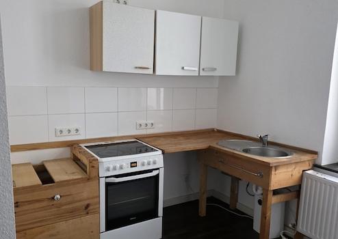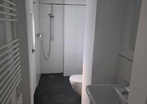 Ein frisch saniertes Badezimmer. Zudem enthält die Miete einen Möblierungszuschlag für eine Küche.