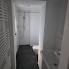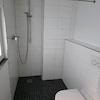 Das Badezimmer wurde vollständig saniert und ist modern gefliest. Es verfügt über eine Dusche, WC und Waschbecken.