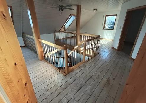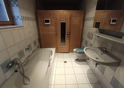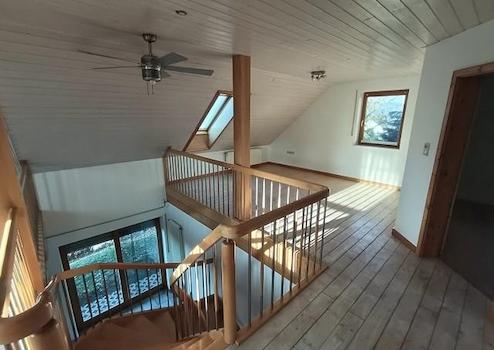 Grosses Wohnzimmer, angrenzende Küche mit Vorratsraum, 2 Galeriezimmer, offene Bauweise, Licht durchflutet. 3 Schlafzimmer, Tageslichtbad mit Wanne, Dusche und Blockbohlen-Sauna (neuer Ofen mit Steuerung), Zweite Bad im OG. Tageslicht Toilette und Handwaschbecken. Alle Fenster mit Aussenrollos.