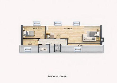 Zur besseren Darstellung wurden die dunklen Holzdecken mit Hilfe von KI durch weiße Decken ersetzt. Originalbilder können auf Wunsch zugesendet werden.