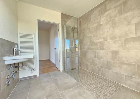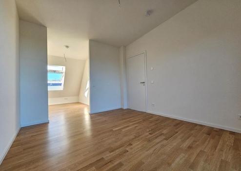 Das Penthouse besteht aus einem großzügigen Wohn- und Essbereich mit Eichen-Echtholzparkett, einem Duschbad, einem Schlafzimmer mit Ankleide oder Arbeitsbereich, sowie einem Hauswirtschaftsraum mit Waschmaschinen- und Elektroanschluss. Das Badezimmer ist in zeitlosem Design gestaltet mit einer hochwertigen Ausstattung von Villeroy & Boch und Hansgrohe.