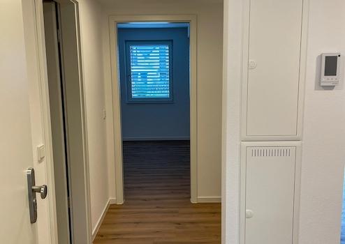 Die Wandflächen aller Wohnräume werden mit einer neutralen Raufasertapete mittlerer Körnung tapeziert und weiß gestrichen. Die Deckenflächen werden mit einem hellen Anstrich versehen. Innerhalb der Wohnungen wurde der Boden aller Wohnräume mit Vinyl-Paneelen in Holzoptik verlegt. Die Bäder erhalten einen Fliesenbelag. Weiße Innentüren harmonieren mit dem modernen Raumkonzept, und die Küchen sind bereits eingebaut.