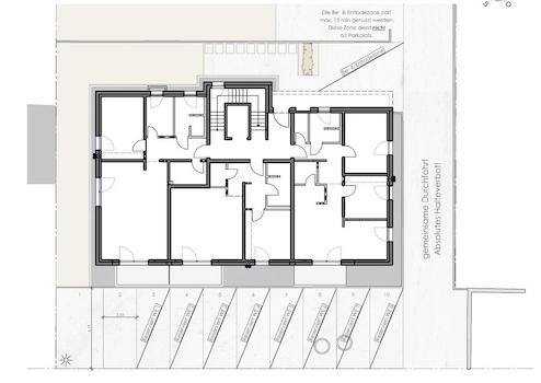 Der überdachte Eingangsbereich beherbergt den vor Witterung geschützten Briefkasten und die Video-Gegensprechanlage. Für den Komfort der Bewohner befinden sich zehn PKW-Stellplätze unmittelbar vorm Haus. Alle Stellplätze sind gemäß dem Gebäudeelektromobilitätsinfrastrukturgesetz (GEIG) mit entsprechenden Anschlüssen für E-Fahrzeuge ausgestattet.