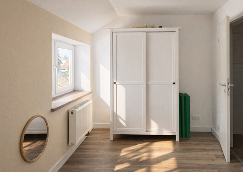 Im ausgebauten Dachgeschoss stehen Ihnen zwei helle Schlafzimmer mit Laminatboden und klassischen Heizkörpern zur Verfügung. Ein bereits vorbereitetes WC mit vorhandenen Anschlüssen eröffnet Ihnen die Möglichkeit, Ihre persönlichen Ausstattungswünsche umzusetzen. Vom Kinderzimmer aus erreichen Sie zudem einen Teil des Dachspitzes, der sich bei Bedarf weiter ausbauen lässt, etwa als zusätzliche Schlafebene. Das Dach wurde im Rahmen der Sanierung teilweise neu gedämmt und eingedeckt.