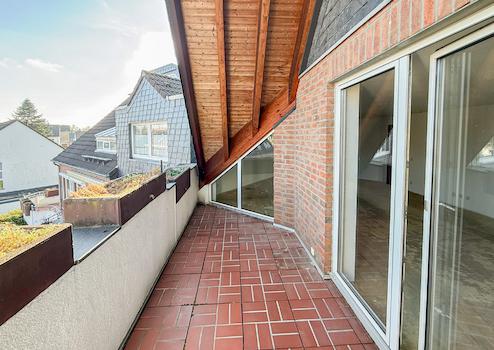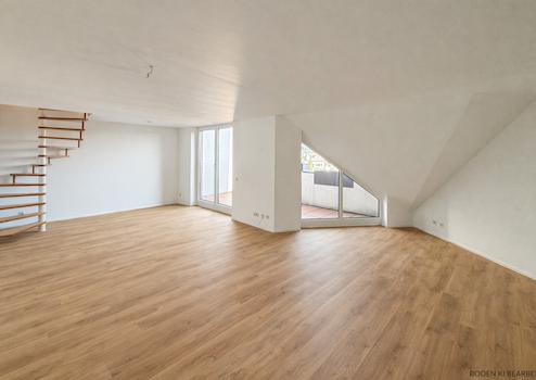 Die Dachgeschosswohnung auf zwei Ebenen präsentiert sich äußerst großzügig. Auf ca. 104 m² Wohnfläche verteilen sich drei Wohn- und Schlafräume, Küche, zwei Bäder und Loggia.