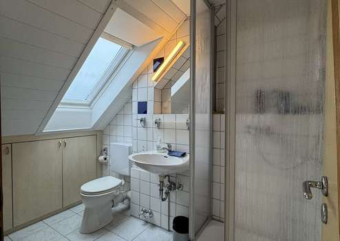 - 1 Badezimmer (Fenster, Dusche, WC, Waschbecken) im Dachgeschoss