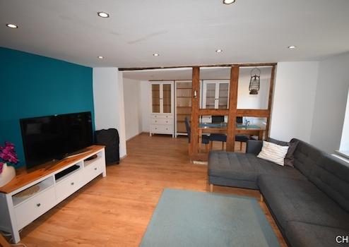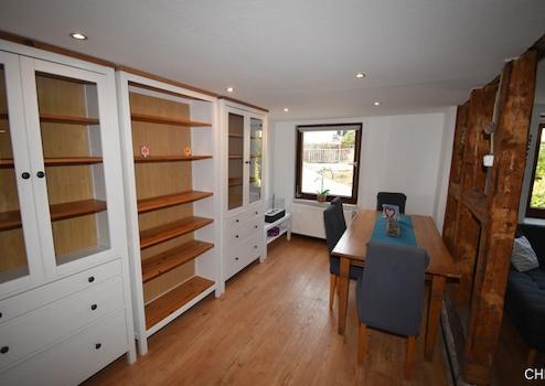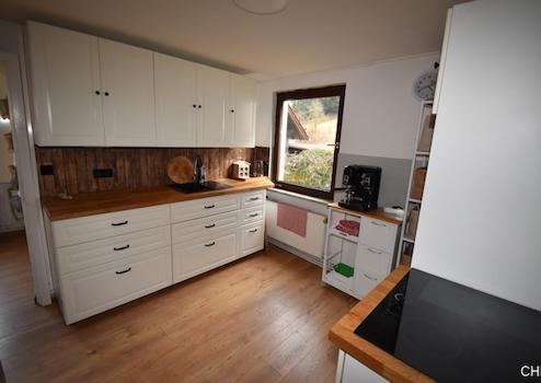 Über eine paar Stufen gelangt man in das kleine und gemütliche Haus. Im Erdgeschoss gibt es das Badezimmer ausgestattet mit Badewanne, WC und Waschmaschinenanschluss. In die Küche wurde erst 2021 mit eine schicke Einbauküche eingebaut und ist im Kaufpreis enthalten. Gleich neben der Küche kommen wir nun in das große Wohnzimmer mit sep Essbereich. Dieser ist optisch getrennt durch das offen gelegte Fachwerk, welches dem gesamten Raum eine sehr schöne gemütliche Atmosphäre gibt.