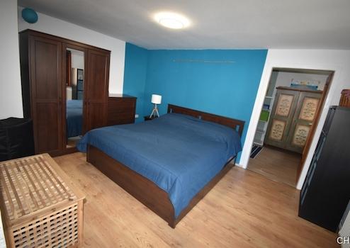 Über eine kleine Treppe vorn am Eingang gelangt man in das Obergeschoss. Hier stehen dem neuen Eigentümer ein großes Schlafzimmer mit angrenzenden Ankleide- oder Kinderzimmer und ein weiteres Kinderzimmer zur Verfügung. Über eine Einschubtreppe kommt man in den Dachboden, welcher zu Lagerzwecken dient.