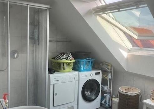 - Bad mit Dusche, Waschbecken und Stellplatz für Waschmaschine