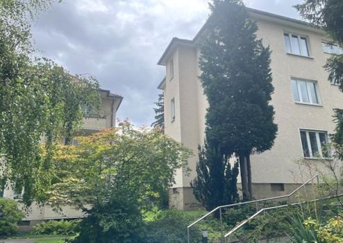 Die ETW verfügt über einen sehr schönen Grundriss, eine moderne Einbauküche und einen schönen Balkon mit attraktivem Blick ins Grüne und auf die von alten Bäumen gesäumte Nebenstraße. Das Gebäudeensemble ist von einem sehr gepflegten parkähnlichen Garten umgeben.