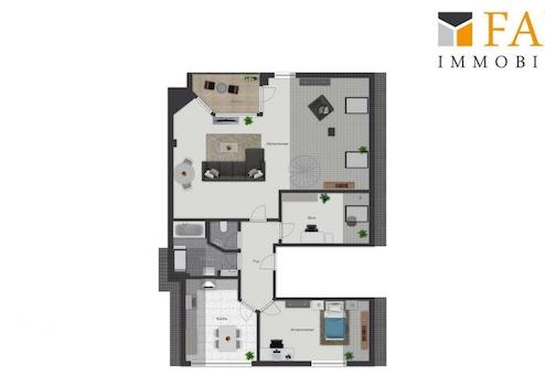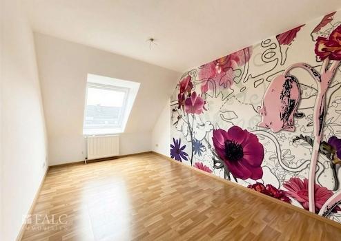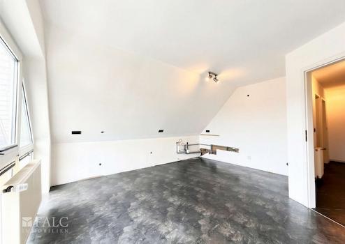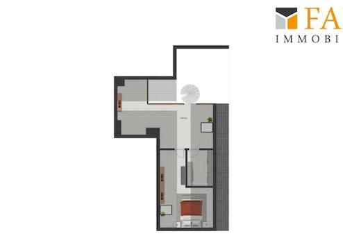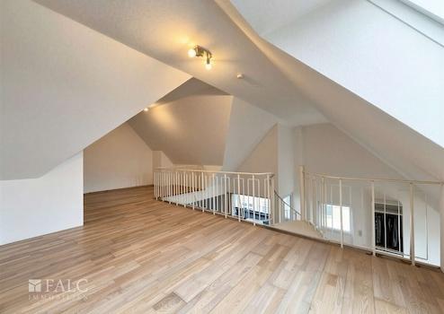 Eine Wendeltreppe führt vom Wohnbereich hinauf zur offenen Galerie. Sie verbindet die Ebenen auf harmonische Weise und setzt einen architektonischen Akzent, der dieser Wohnung ihren besonderen Charakter verleiht. Die Dachgeschossebene dient als Nutzfläche und ist ideal als Hobbyraum, Arbeitsbereich oder Rückzugsort für kreative Tätigkeiten geeignet. Ein eigenständiger, abgeschlossener Raum bietet hier zusätzliche Nutzungsmöglichkeiten. Ergänzt wird dieser Bereich durch einen angrenzenden Abstellraum, der sich hervorragend als Ankleide eignet.