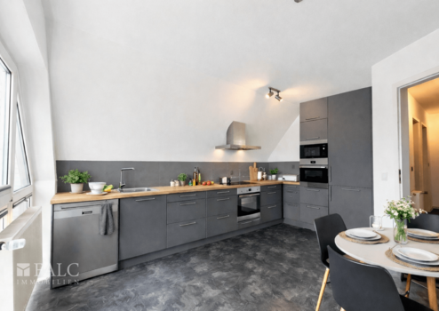 Das Herzstück der Wohnung bildet das großzügige Wohn- und Esszimmer. Hohe Decken und die offene Galerie schaffen hier ein außergewöhnliches Raumgefühl mit viel Luft und Licht. Große Fensterflächen lassen den Wohnbereich hell und einladend wirken. Von hier aus gelangen Sie auf den Balkon in Westausrichtung, der besonders in den Abendstunden zum Entspannen einlädt.