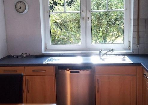 • Wohnküche mit Herd, Ofen, Dunstabzugshaube und Spülmaschine