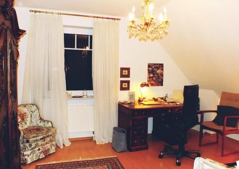 Ergänzt wird die Wohnfläche durch einen attraktiven, kostspielig ausgebauten Spitzboden im 2. OG mit 15,4m² (Grundfläche: 27,3m²), der mit Laminat, Flachheizkörper und zwei großen Dreiecksfenstern mit maßgeschneiderten Jalousien zur Westseite ausgestattet ist. Er ist mit einem Geländer aus Kiefer abgesichert und über eine Raumspartreppe zugänglich.